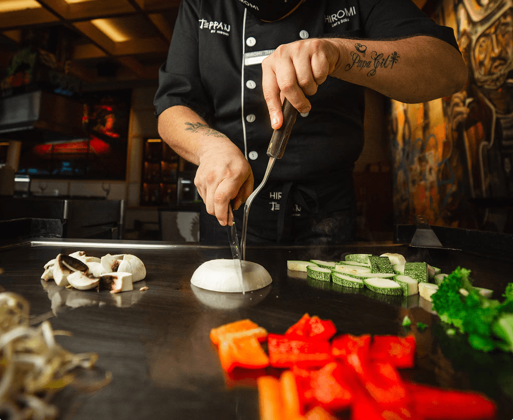 El ritual del teppanyaki con fuego, técnica y sabor preparados frente a los comensales en un formato dinámico e interactivo.